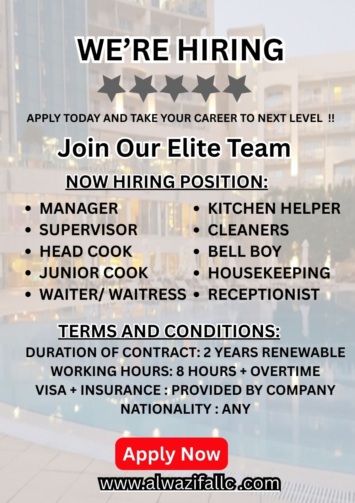If you seek honest work with fair pay, a safe working environment, and a clear career path, the UAE’s luxury hotel sector welcomes you. Take the first step towards a brighter future for yourself and your family by applying through Al Wazifa LLC today!