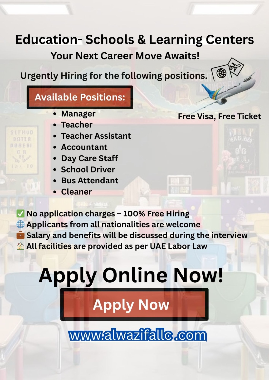 Start your teaching journey today. Apply through Al Wazifa LLC and take the first step toward a fulfilling career in the UAE!