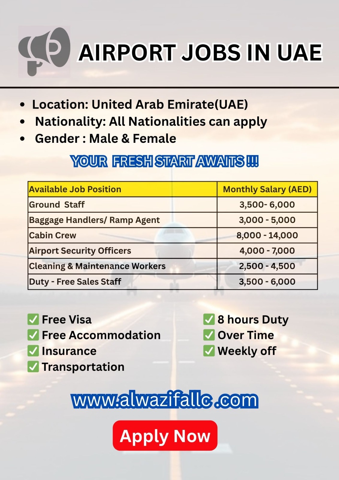 If you have the passion to work hard and the commitment to grow, your opportunity is here. Apply today through Al Wazifa LLC and take your first step toward a rewarding airport career in the UAE!